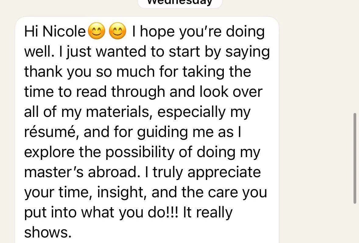 Working with Nicole has been absolutely life-changing. I had always dreamed about moving to Spain, but it felt overwhelming—like a far-off fantasy. Nicole helped me turn that dream into a plan. With her guidance, I created a realistic budget, saved over $5,000, and got accepted to teach English in Valencia! She helped me stay accountable, encouraged me when I doubted myself, and believed in me even when I wasn’t sure I could do it. Nicole doesn’t just coach you—she walks alongside you and cheers you on every step of the way. I truly don’t think I’d be living my dream in Spain without her.