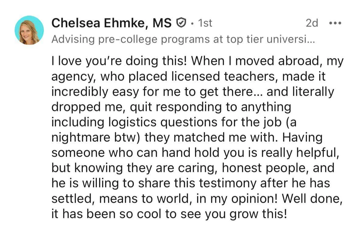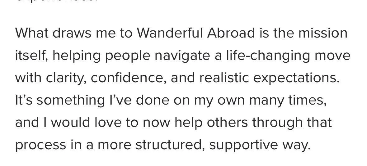 "Wanderful Abroad has been an incredible resource, providing me with the guidance and confidence I needed to pursue a career abroad. I genuinely don’t think I would have made it this far without their support. Just a few months after starting my journey, I was preparing to move across the globe! The ongoing support I’ve received has been absolutely crucial to my successful transition to living abroad. I can’t recommend Wonderful Abroad enough to anyone considering this life-changing journey! "